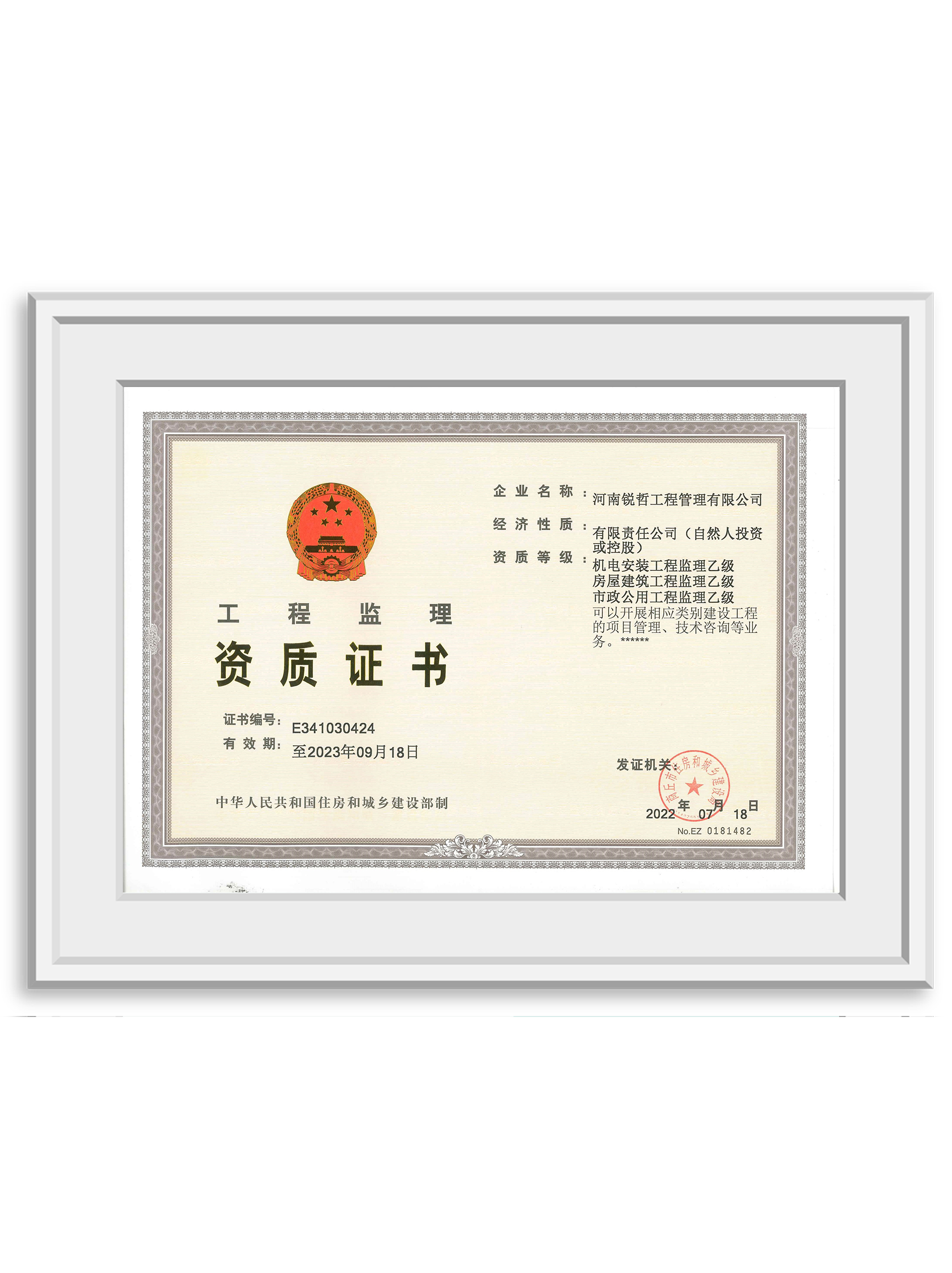 工程监理资质证书(机电安装、房屋建筑、市政公用工程乙级)
