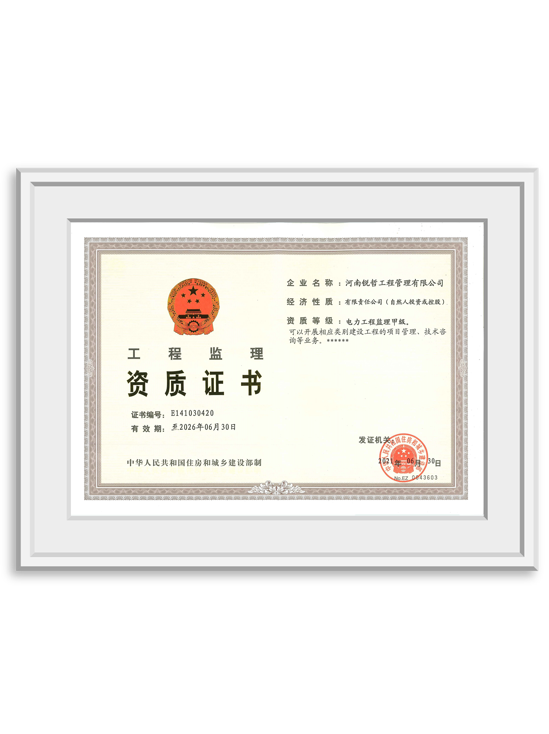 工程监理资质证书(电力工程监理甲级)
