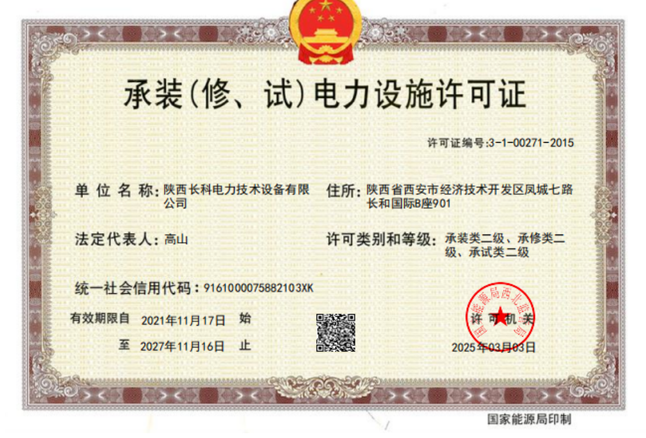 陕西长科承装(修试)二、二、二级资质获批 近日,同信能源旗下核心企业陕西长科电力技术设备有限公司(以下简称“陕西长科”)今日正式宣布,公司成功升级电力行业承(装修)试