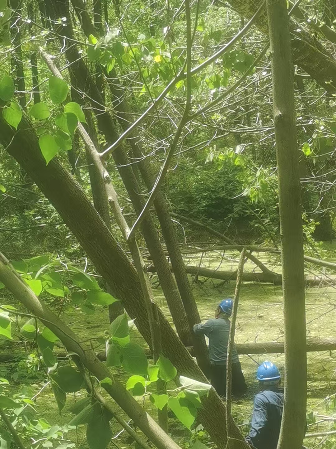 "人工清障是唯一选择!" 没有片刻犹豫,张震和褚廷山抄起手锯就踏入池塘。浑浊的水面下暗藏危险,两人用木棍探路,每一步都走得小心翼翼。"水越来越深,最后都快淹到腰部了。"事后回忆时,褚廷山仍心有余悸。岸上的同事用绳索固定树干,防止锯断时砸伤抢修人员。
